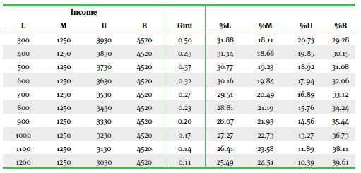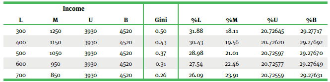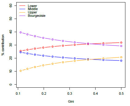The contribution to inequality of the lower class decreases once getting income from the middle class, at some point this contribution is almost the bourgeoisie. Note that in this scenario, we can obtain a Gini index of at least 0.26.
