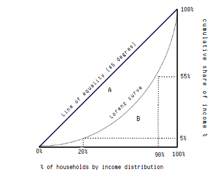 be the wealth distribution function; that is,L(x) measures the proportion of wealth accumulated by percent x of the population. Graphically, the Gini index is calculated as the ratio of two areas. If a is the cumulative area between the Lorenz curve and the diagonal of the unit square (the graph of the function and b is the area below the Lorenz curve, then the Gini index is calculated as