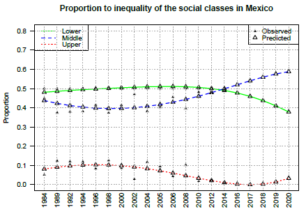 Using the predictive model with a hyperspherical transformation and the data from enigh, we can estimate and predict the proportion of inequality by social classes in Mexico. The results are presented in Figure 9.