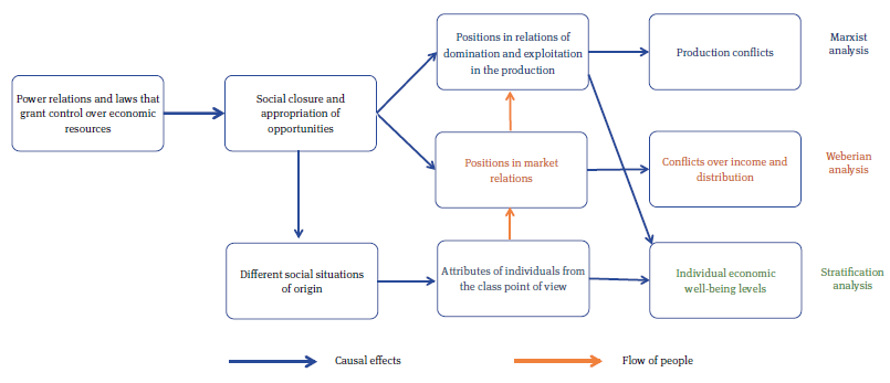 Wright (1994) identifies three ways to approach class concept: Firstly, class as a set of attributes and living conditions of individuals (adopted by stratification studies), secondly, class based on the accumulation mechanisms determined by the control of economic resources (referred to Max Weber theory), defining the classes concerning the processes of “appropriation of opportunities” focused on three dimensions: economy, status, and power (Negrete and Romo, 2014); and finally, the Marxist point of view that studies the positions in the relations of domination in production. Wright integrates these three points of view since he does not consider them mutually exclusive, rather than interrelated, since the three processes operate in the society and are connected and in a permanent interaction (see Figure 2).