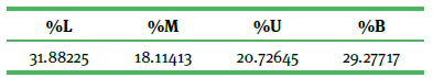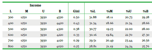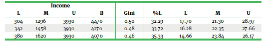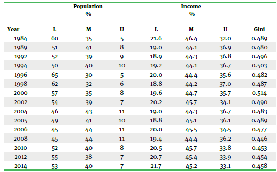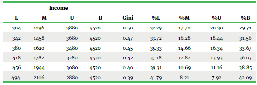 For 2014, Mexico has a Gini index of 0.458. Applying the function also with 3 social classes, the percentage of contribution of the Gini index for each class is given by: the and L 43%, M 7%, U 50%.