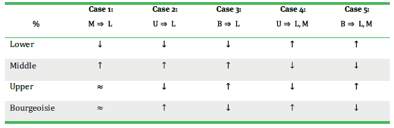 In the following, we present five hypothetical cases, where the upper classes give income to lower classes (see for example Delajara, De la Torre, Díaz-Infante, Vélez [2018]).