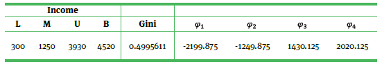 This means, in terms of the Gini index, that if the income of some social class is increased by then, the contribution of this class to the “new inequality” equals the contribution given by the class before increasing, plus and other value in . This interval depends on and and the number of analyzed classes, however, it is a small quantity compared to