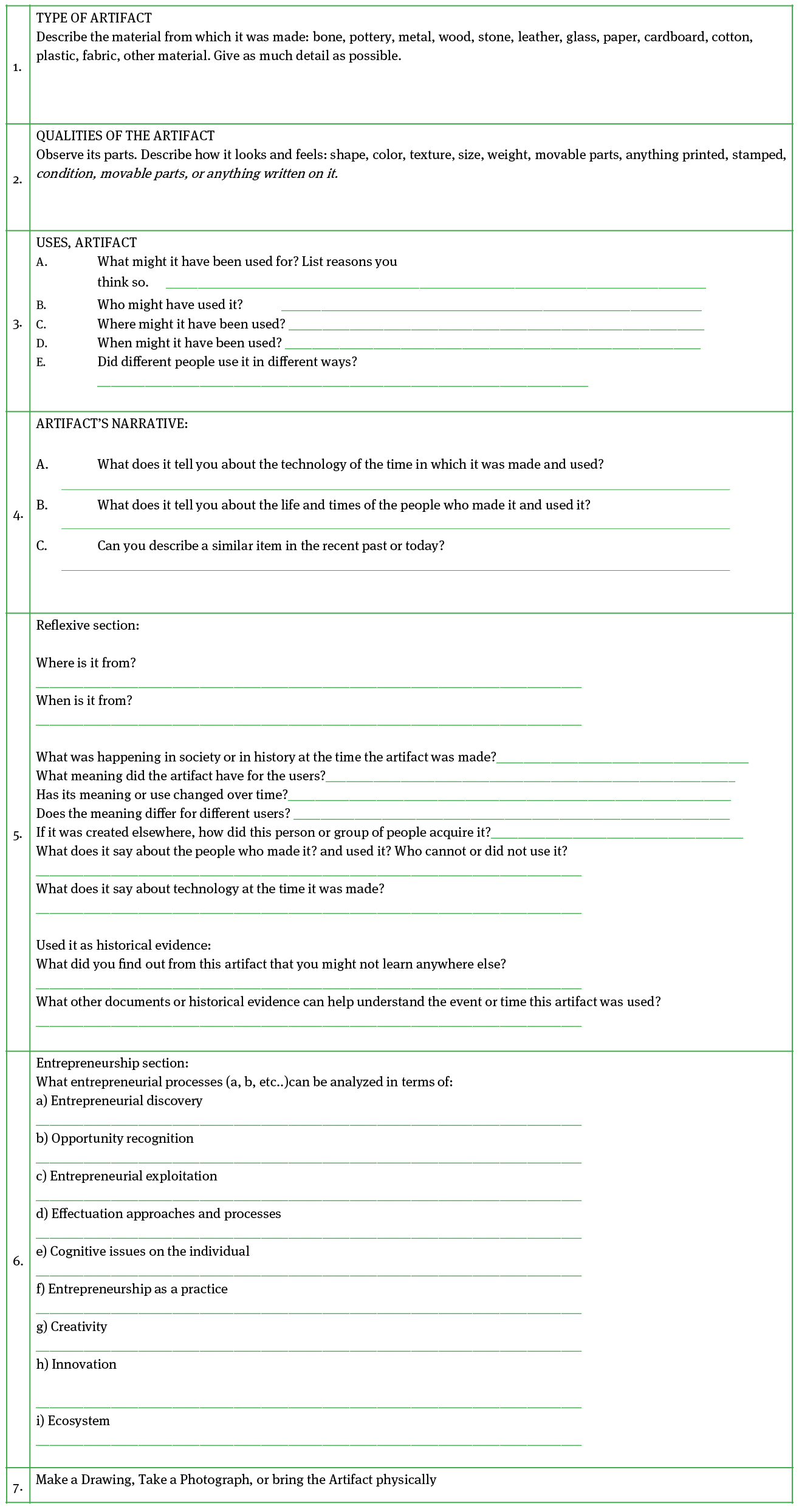 Annex A shows a proposal on what a potential analysis can be made applying ia into entrepreneurship, stating first that there is no one right way to analyze artifacts (Norum, 2008). In sections 1 through 4, the artifact is under a deep review (type, qualities, uses, and the “narrative” it can have on its embodied entrepreneurial processes). In section 5, there is a reflexive area for the researcher, in section 6 an exploration of what interpretation from the entrepreneurship standpoint it can be made as a first step towards the artifact, “creative ways they use the past to imagine the future” (Wadhwani and Lubinski, 2017, p. 11). It is included creativity, innovation since both are intertwined with entrepreneurship. Finally, section 7 is open for all the graphical or digital, or physical information to be collected.