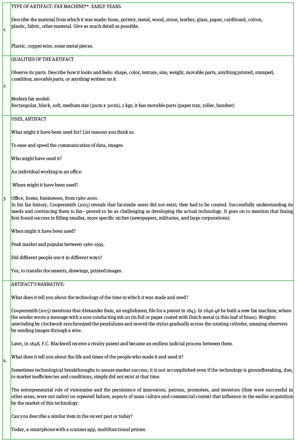 For example, a quilt made around the time of the U.S. Civil War can tell us ideas about abolition, how they raise funds or bury a soldier, and the materials about what resources were available to the quilt maker (Norum, 2008). In Annex B, a brief and exploratory example is done to show how the proposal can be applied, in this case, to analyze the fax machine.