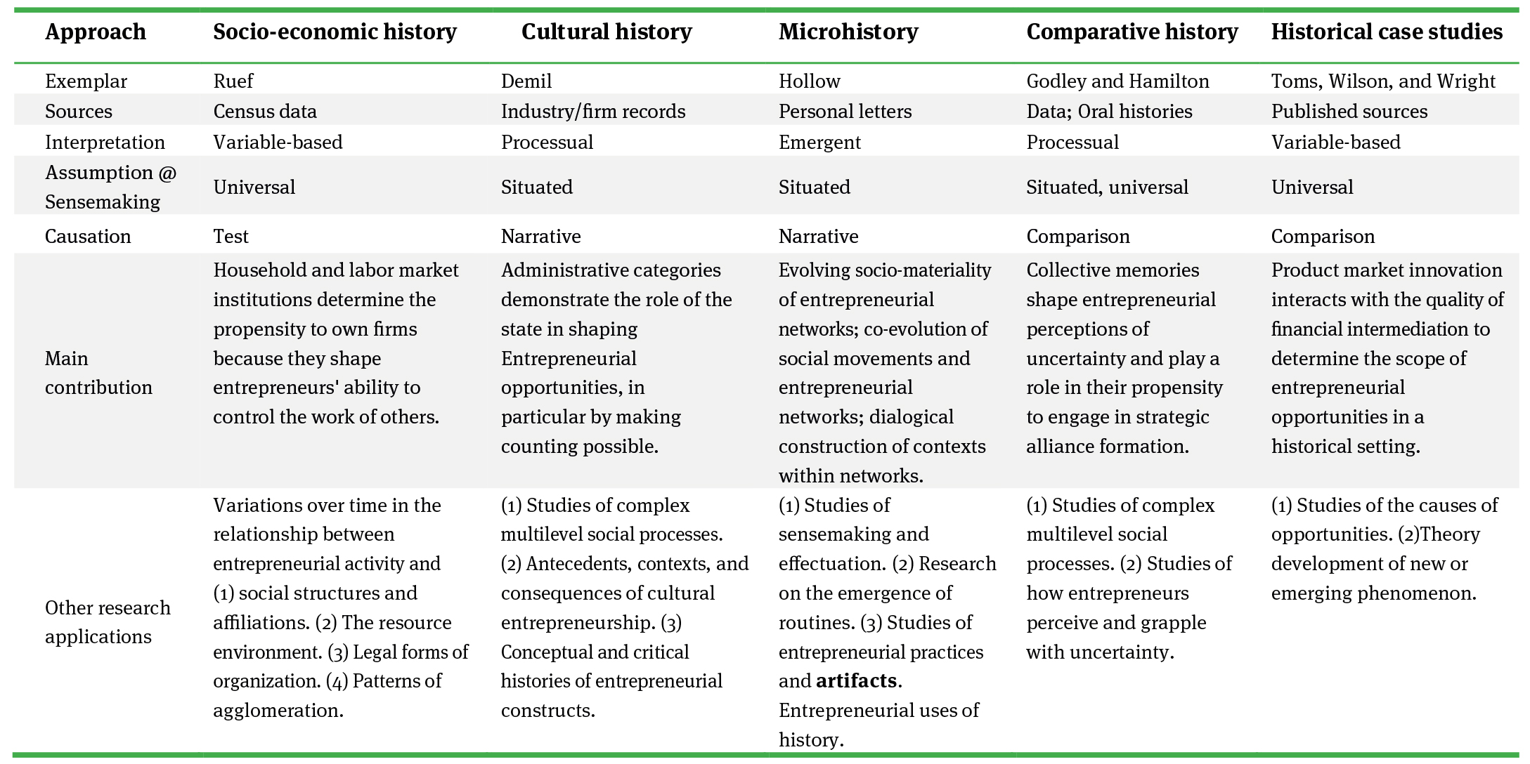 Wadhwani (2016) suggests 3 other historical techniques that can be used and applied in conjunction with source, triangulation, and hermeneutic interpretation with potential relevance to contextualization in entrepreneurship research, structural history, microhistory, and conceptual history. The present proposal can be used in all those techniques.