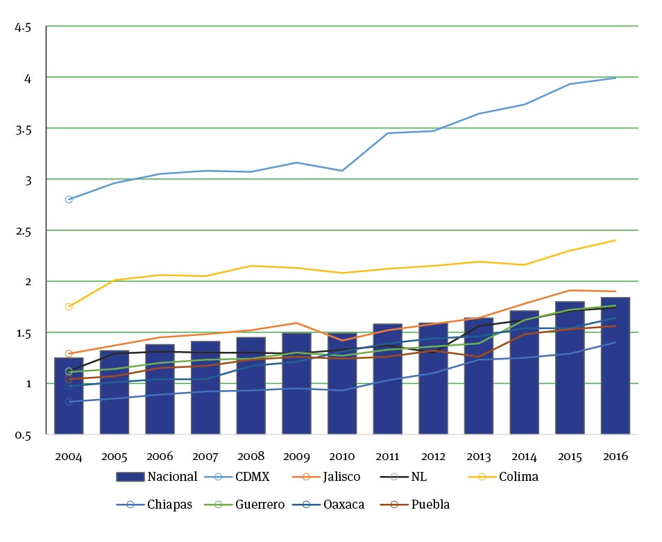 El segundo aspecto relevante se refiere a la distribución por estados y zonas geográficas (figura 1). Los valores más altos corresponden a la capital del país (mostrando también incremento superior) seguida de Colima (un estado pequeño de la costa pacífica), Jalisco y Nuevo León (entidades con elevado desarrollo económico en el contexto nacional). En contraste los estados con mayores rezagos sociales y económicos presentan las tasas más bajas de disponibilidad, aun cuando las tasas de incremento son mayores en comparación con los estados de mayor desarrollo económico (figura 2). Si bien la estimación de tasas generales por estados es un referente, permite suponer la agudización de esa situación al interior de cada estado en detrimento de zonas con mayores carencias, tornando aún más complicado brindar servicios de salud a toda la población, especialmente a la carente de seguridad social.
