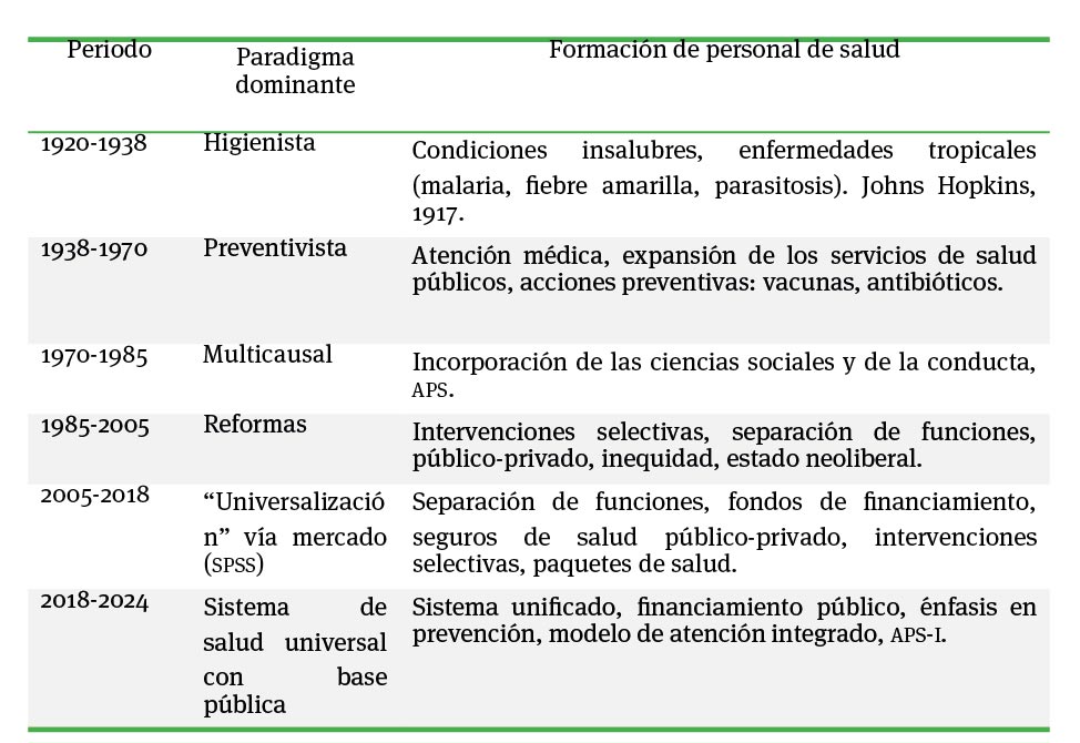 En México esto es un escenario complejo para las instituciones formadoras porque es imprescindible considerar a la aps-i como una de las estrategias más importantes para reducir las brechas de desigualdad en salud (Rasanathan et al., 2009), lo cual significa priorizar las acciones de prevención, educación y promoción de la salud. Simultáneamente es fundamental formar profesionales médicos con ese perfil. Se trata de transitar de un modelo de formación basado en la curación a uno que incorpore una visión integral de la atención a la salud: promoción de la salud, prevención de la enfermedad, atención y rehabilitación (Sigerist, 1944). Tanto el abordaje de los determinantes sociales de la salud como la promoción de la salud son fundamentales para la reorientación de los servicios de salud en México y representan un reto fundamental, sobre todo porque deben ser incorporados en el proceso de formación de los profesionales de la medicina, así como en los procesos de atención de las instituciones prestadoras de servicios. Por lo tanto, la formación de médicos no solo es un problema cuantitativo sino que implica además un cambio de paradigma en la formación. Este cambio necesario debe darse también en la lógica de la atención, porque son espacios con influencia determinante en la formación de profesionales de la salud (Jarillo, 2007).