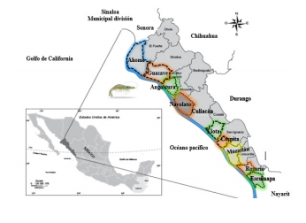 Para el desarrollo de la investigación empírica se tomó como unidad de análisis a la población compuesta por las organizaciones (granjas) dedicadas a la producción de camarón blanco cultivado en ambientes controlados de la región mencionada. El estudio se limitó a las granjas camaronícolas situadas a lo largo del litoral (656 kilómetros) del estado de Sinaloa. A continuación se presenta la distribución geográfica de los municipios del estado de Sinaloa donde se ubican las 102 granjas camaroneras estudiadas (imagen 1).