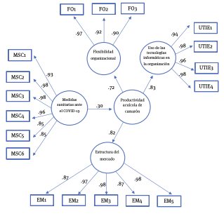 En la figura 1 se presenta el modelo estructural el cual muestra el efecto de las medidas sanitarias ante el COVID-19 en la productividad acuícola de camarón. Los factores de primer orden (estructura del mercado, uso de las tic en las Pymes, flexibilidad organizacional) emergen de forma coherente a partir de las relaciones altas y significativas que presentan sus indicadores manifiestos (ítems), donde las cargas factoriales indican validez de constructo convergente. El modelo muestra que la contingencia sanitaria del COVID-19 produjo un efecto positivo y significativo en la productividad acuícola de camarón (0.30). Lo anterior supone, que en la medida en que las organizaciones atienden las recomendaciones sanitarias de salud pública y desarrollan medidas de inocuidad y buenas prácticas, así como un plan de mitigación ante riesgos sanitarios, es posible que mejore la productividad en el cultivo de camarón en las organizaciones. La efectividad en la productividad, a su vez, es apoyada por la flexibilidad organizacional, el uso de las tic y una sólida estructura del mercado.