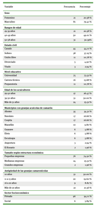 Respecto a las organizaciones encuestadas, los gerentes son procedentes de 102 granjas de camarón de granja en el subsector de la acuacultura del estado de Sinaloa de los municipios de Ahome (n = 35), Guasave (n = 6) (sur/norte), Angostura (n = 3), Navolato (n = 17), Elota (n = 6), Cospita (n = 17), Mazatlán (n = 10), El Rosario (n = 2) y Escuinapa (n = 6) (figura 1). Esta industria acuícola coadyuva al desarrollo regional de las comunidades rurales asentadas en la costa del estado de Sinaloa. La aplicación de la encuesta se llevó a cabo durante los meses de marzo a noviembre de 2020. De acuerdo con el tamaño de las granjas acuícolas encuestadas, la mayor parte de la muestra estuvo compuesta por pequeñas empresas (74.50 %), seguida de las medianas empresas (23.52 %) y en menor proporción correspondió a las catalogadas como grandes empresas (1.96 %).