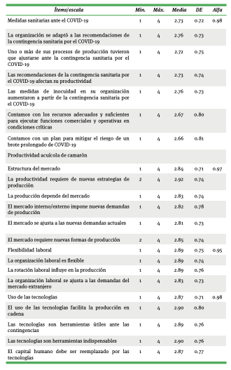 La escala de productividad acuícola de camarón fue elaborada ex profeso para este trabajo. Esta escala quedó conformada por 12 reactivos distribuidos en tres factores: a) estructura de mercado; b) uso de las tecnologías de la información en la organización; y c) flexibilidad organizacional.
