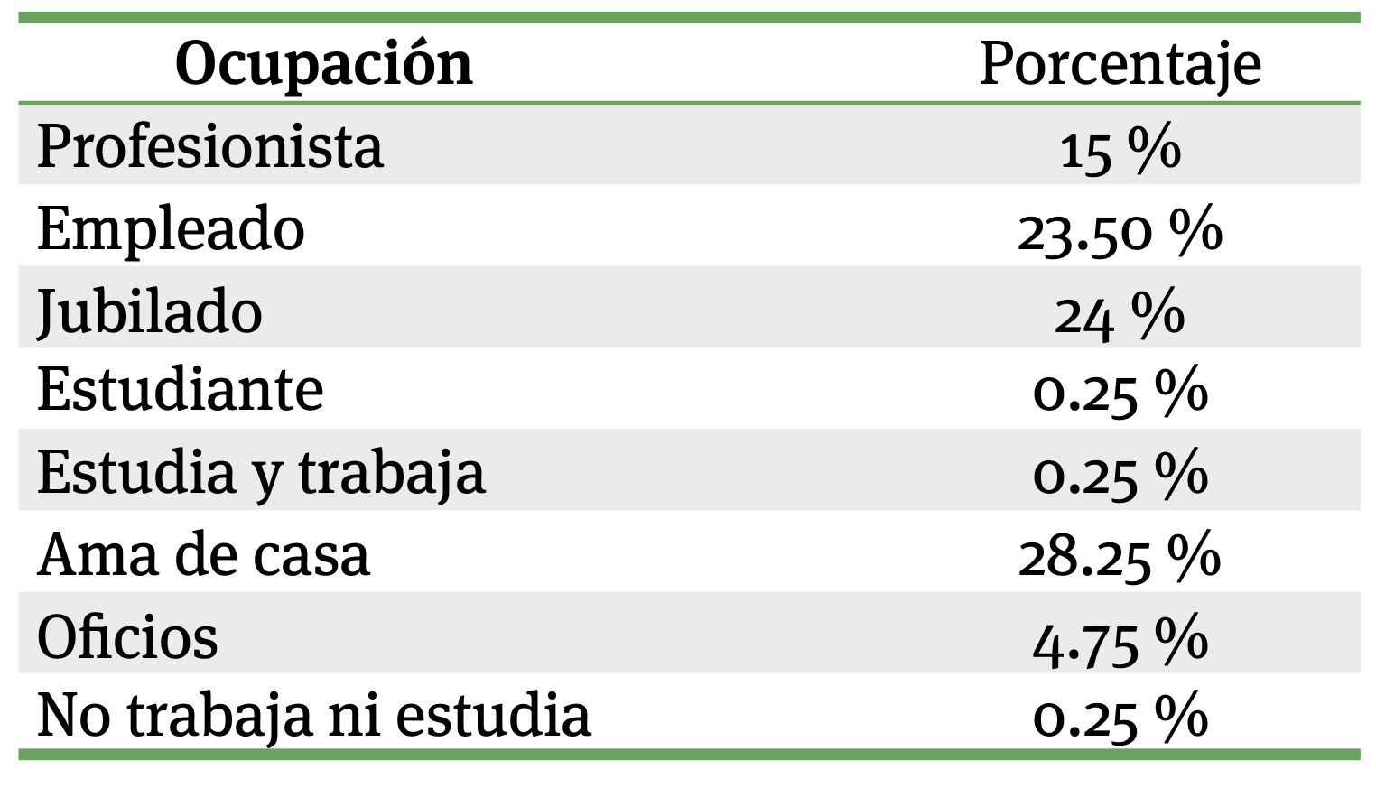 La actividad ocupacional de los pacientes que asistieron durante el estudio a las ceds es diversa: 15 % son profesionistas; 23.50 %, empleados; 16.4 %, jubilados; 24 %, estudiantes; 0.25 % no trabajan ni estudian; 0.25 % dijeron estudiar y trabajar; 33 % identificaron otra actividad (ama de casa 28.25 % y oficios 4.75 %) (tabla 7).