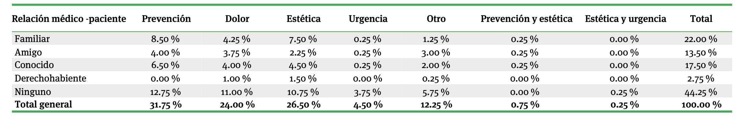 Del total de usuarios de las ceds, 31.75 % mencionó como motivo de consulta la prevención, 19 % manifestó algún vínculo con el estudiante, mientras 12.75 % no manifestó ningún vínculo; 24 % acudió por presentar dolor, observándose una proporción igual con referencia a la relación médico-paciente; 26.50 % refirió acudir por estética (14.25 % con nexo y 12.25 % sin nexo); 4.50 % asistió por urgencia (0.75 % con alguna relación con el estudiante y 3.75 % con ninguna relación); 12.25 % acudió por otros motivos (6.50 % con alguna vinculación y 5.75 % sin ninguna); 0.75 % acudió por prevención y estética, perteneciendo todos al entorno socio-familiar del estudiante; 0.25 % se presentó por estética y urgencia, sin existir ninguna relación (tabla 9).