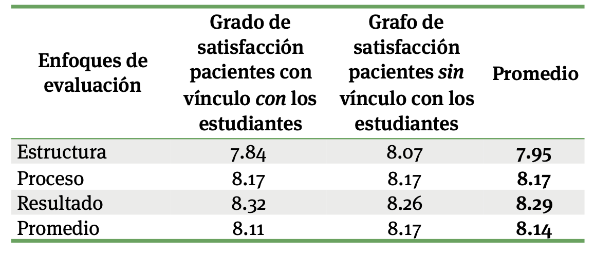 Analizando la percepción de la calidad del servicio con la metodología de Donabedian de acuerdo a la relación médico-paciente, donde el vínculo puede ser familiar, amigo, conocido o no tener ninguno; se observa en el enfoque de estructura una percepción mayor (0.23) comparada con la de los pacientes que no tienen ningún vínculo; mientras que en el enfoque de proceso los resultados muestran una satisfacción igual para ambos grupos (8.17), a diferencia del resultado, donde los pacientes sin vínculo con el estudiante muestran una percepción menor (0.06).