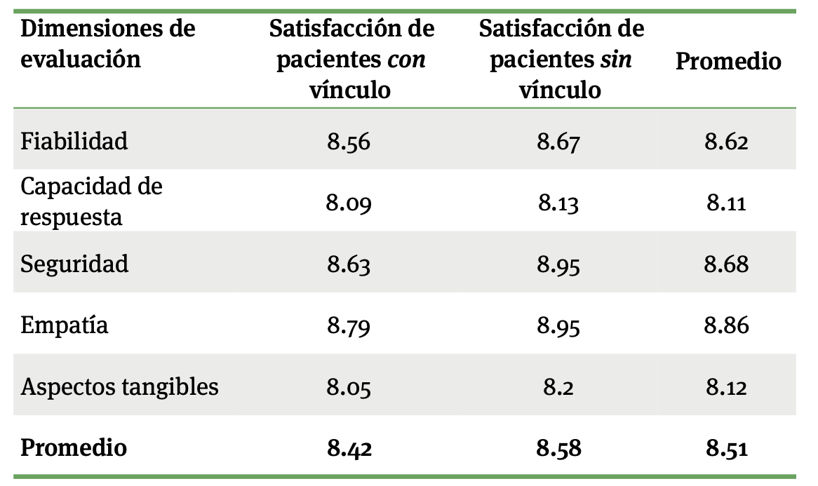 Una vez concluido el proceso de atención se realiza la aplicación del instrumento de evaluación, el cual refleja las percepciones del usuario de acuerdo a las cinco dimensiones, evaluando el desarrollo del proceso y los resultados, es decir, la forma de cómo se percibió el desarrollo del servicio y el resultado de la atención. En el rubro de fiabilidad se obtuvo una evaluación de 8.62; en capacidad de respuesta, 8.11; en seguridad, 8.68; en empatía, 8.86; en aspectos tangibles, 8.12. El promedio final fue de 8.51, se observa una diferencia de 0.16 entre los pacientes con vínculo y los pacientes sin vínculo, siendo mejor evaluada la atención por los pacientes sin vínculo (tabla 11).