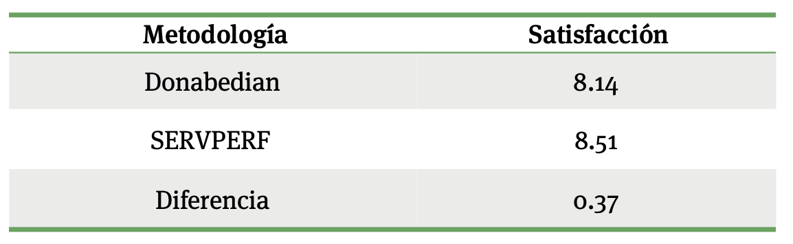 Results: According to the results obtained, the percentage of perception of quality with the Donabedian instrument was lower at 8.14%, compared to those obtained through the SERVPERF methodology which registered 8.51%.