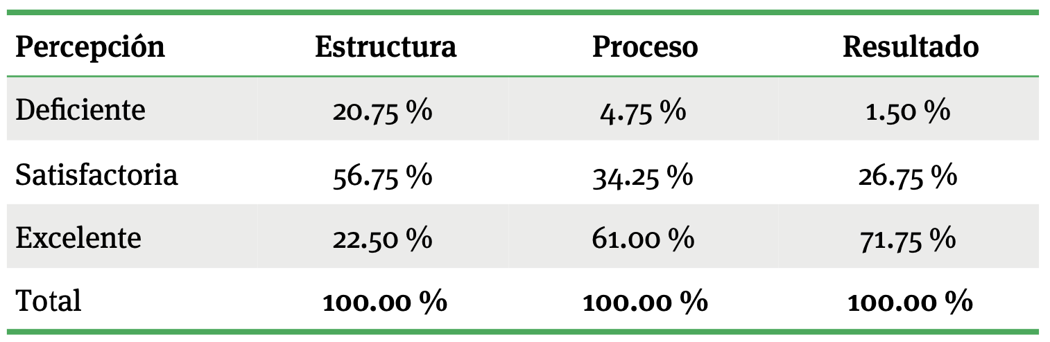 La evaluación de la estructura muestra una evaluación satisfactoria (56.75 %), seguida de una percepción excelente (22.50 %), el porcentaje más bajo lo obtuvo la percepción deficiente (20.75 %); mientras que el proceso presenta una evaluación excelente con 61 %, seguida de una evaluación satisfactoria (34.25 %) y deficiente (4.75 %). En cuanto al resultado, el mayor porcentaje lo ocupa excelente con 71.75 %, seguida de satisfactoria (26.75 %), mientras que deficiente solo obtuvo 1.50 %.