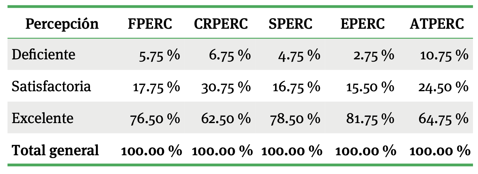 El rubro correspondiente a estructura presentó una evaluación satisfactoria, el proceso tuvo una percepción excelente, mientras que la percepción de la calidad en cuanto a los resultado fue evaluada como positiva (ver tabla 13).