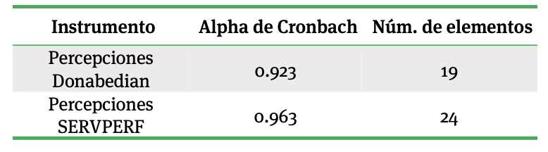 Ambos instrumentos fueron sometidos a una prueba estadística para su validación a través de una alpha de Cronbach, en el instrumento elaborado con la metodología de Donabedian se obtuvo un valor de 0.923; mientras que para el instrumento elaborado con la metodología SERVPERF la prueba arrojo un valor de 0.963 (tabla 3), por lo que el análisis realizado asegura la pertinencia del instrumento.