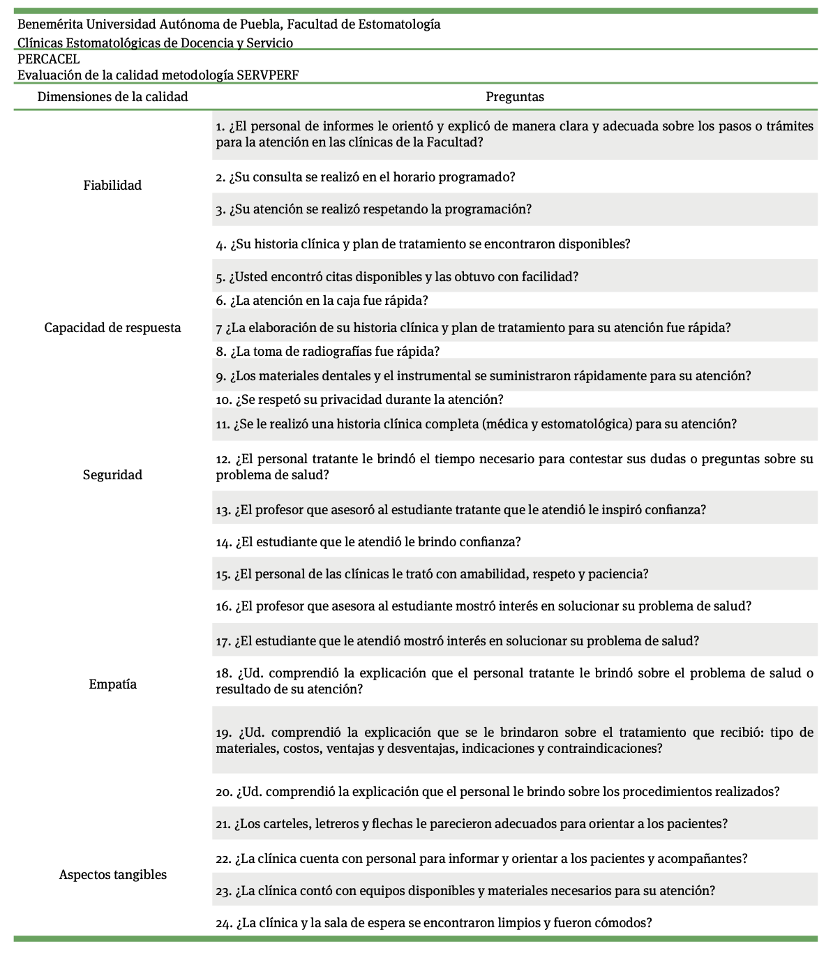 El instrumento cuenta con 24 ítems, a diferencia del modelo original que cuenta con 22 ítems, es importante mencionar que se agregaron dos más porque al ser una ceds, además de participar el personal administrativo y los estudiantes que realizan el acto operatorio participa el docente, quien es el responsable de supervisar el desarrollo de competencias clínicas del estudiante a través de protocolos de atención establecidos con toda la normatividad y principios éticos para la prestación del servicio estomatológico, por lo que en las dimensiones de seguridad y empatía fue considerada la evaluación del desempeño de los docentes, lo que permite identificar la percepción de la calidad del proceso realizado por los mismos.