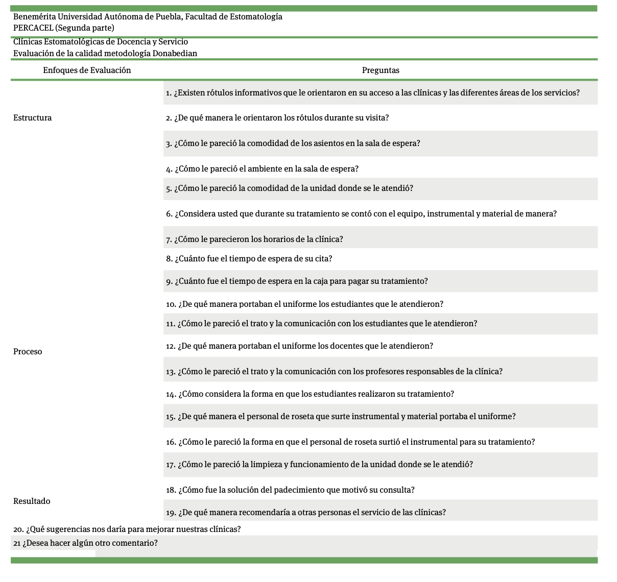En su elaboración se tomaron en cuenta las tres dimensiones propuestas por Donabedian: técnica, personal y amenidades; mismas que son evaluadas a través del enfoque de estructura, proceso y resultado. El instrumento contiene 21 ítems, el primero de los cuales es dicotómico; 18 son evaluados a través de una escala de Likert donde la respuesta 1 corresponde a la valoración muy mala, 2 a mala, 3 a buena, 4 a muy buena y 5 a excelente; las dos últimas preguntas son abiertas.