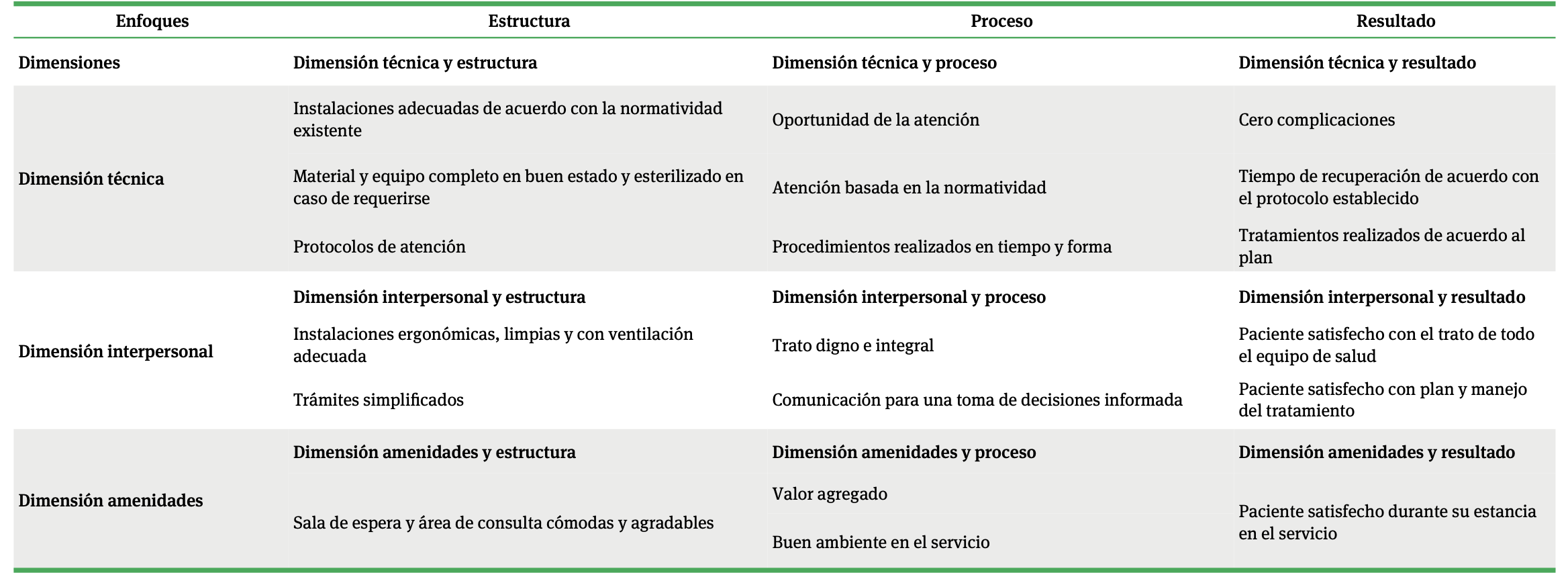 La metodología de Donabedian otorga 25 % del peso a la estructura y 75 % al proceso, lo que nos lleva a una gran reflexión, contar con una gran estructura garantiza una parte de la atención, pero el proceso representado por el conocimiento, capacidad y actitud humana es responsable del mayor peso de la calidad. Analizado de esta forma, las dimensiones técnica, interpersonal y amenidades quedarían incluidas en el encuadre metodológico de estructura, proceso y resultado (tabla 1).