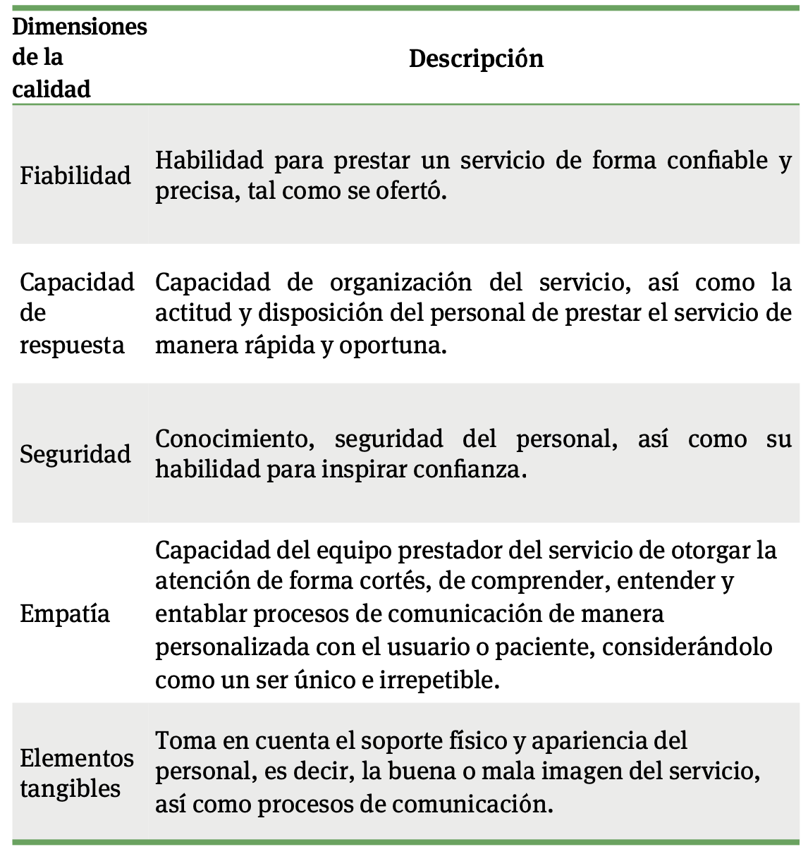 En 1985, Parasuraman et al. identifican cinco dimensiones de la calidad del servicio: fiabilidad, capacidad de respuesta, seguridad, empatía y elementos tangibles (tabla 2).