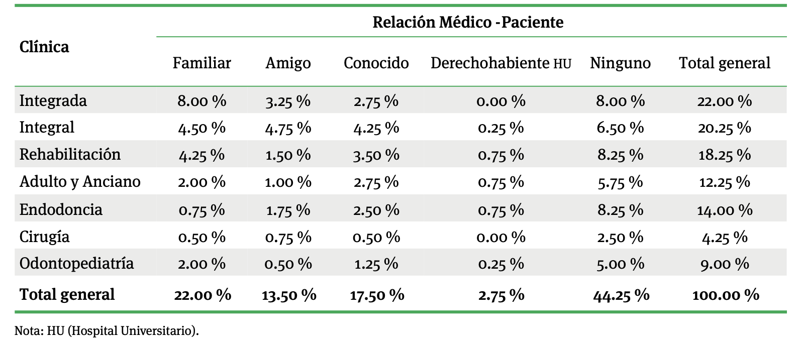 En cuanto a la relación médico-paciente, 53 % de la población atendida tiene algún nexo con el estudiante que le otorgó la atención, quizá debido a la necesidad de los alumnos de buscar, en su entorno familiar y social, pacientes que requieran los tratamientos solicitados en los cursos de las diferentes clínicas –dada la insuficiencia del banco de pacientes existente en el programa educativo– con la finalidad de desarrollar sus competencias profesionales y aprobar el curso, proceso bidireccional que beneficia tanto al estudiante como al paciente, debido a que en México existe poca cultura de prevención en salud general y menos aún en salud bucal. El resto de la población no tiene vínculo alguno, son pacientes que generalmente buscan el servicio por la facilidad de los horarios aun contando con seguridad social, por no tener capacidad económica para atenderse de manera privada o son derechohabientes universitarios (tabla 4).
