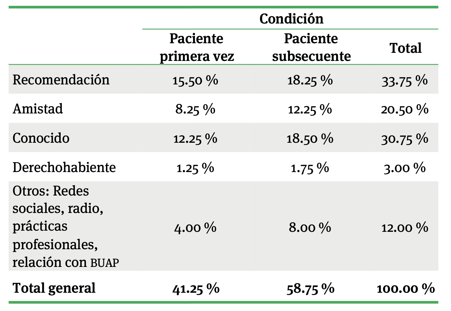 El porcentaje de población usuaria de primera vez fue de 41.25 %, de ella, 33.75 % mencionó haber sido recomendada, en concordancia con los enfoques de calidad donde se menciona que 30 % de la población usuaria de un servicio corresponde a pacientes referidos por otros que han quedado satisfechos, observado también en el modelo de la nueva gestión pública (ngp) y en el enfoque del usuario como cliente (tabla 5).