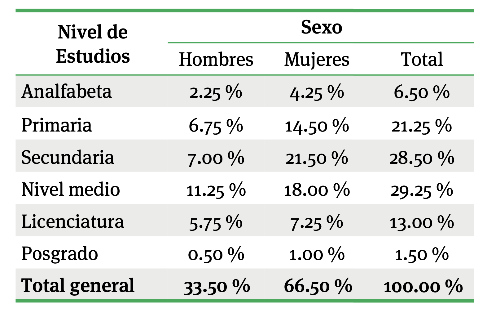 De los 400 pacientes encuestados, 66.50 % (dos terceras partes) fueron mujeres y 33.50 % hombres. Con referencia al nivel de estudios, es interesante observar que la población de mujeres presentó un mayor porcentaje de analfabetismo; pero también se identifica que, en los niveles de primaria, secundaria, nivel medio, licenciatura y posgrado el porcentaje es significativamente mayor que en el caso de los hombres, resultado que puede deberse a la característica de la muestra (tabla 6).