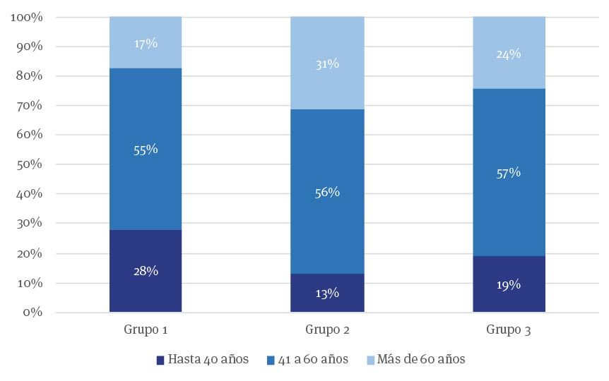 Con relación a la edad, se observó que el grupo 2 que tiene mayor uso de recursos digitales para la docencia y mayor uso de plataformas para interactuar con estudiantes, también presentó el porcentaje más alto de docentes jóvenes. Por el contrario, el grupo 1 que tiene la menor experiencia previa en educación en línea y a distancia se identifica porque tiene el porcentaje más alto de docentes con más de 60 años (28%). El grupo 3, tiene una distribución similar al grupo 2, aunque el porcentaje de docentes más jóvenes disminuye ligeramente y el de más de 60 aumenta (figura 1).