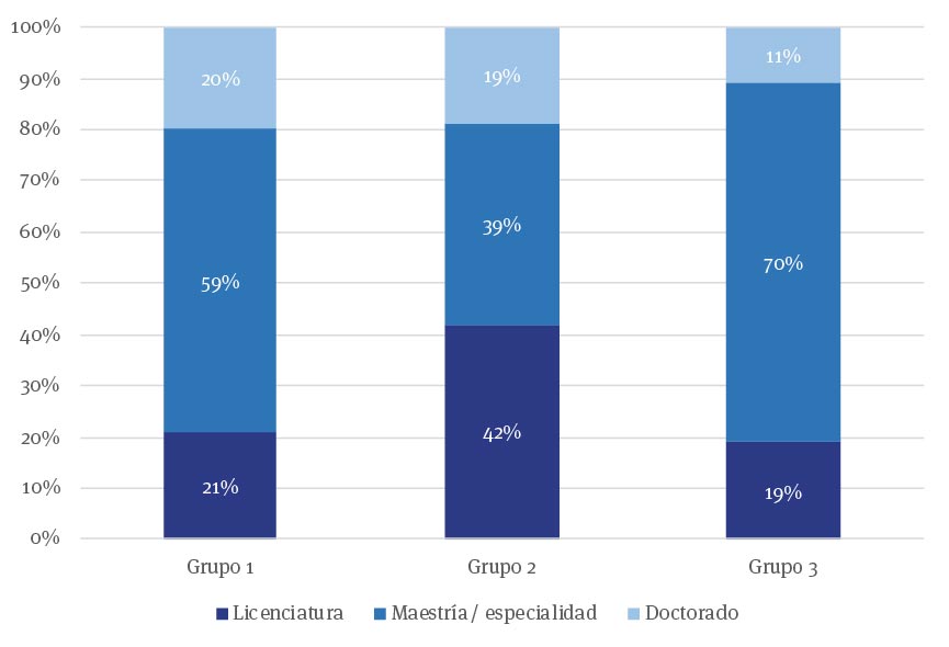Con respecto al nivel máximo de estudios de las y los docentes que contestaron el cuestionario, destaca el grupo 2, ya que tiene el porcentaje más alto de docentes que poseen doctorado con 42% y que tienen mayor uso de recursos digitales (factor 3), así como mayor uso de plataformas (factor 5), mientras que, el grupo 3 sobresale porque 70% de las y los docentes tiene maestría o especialidad y mayor experiencia previa en educación a distancia. El grupo 1 presenta el porcentaje más alto de docentes con licenciatura con 21%, el que tiene menor experiencia previa en educación a distancia y en línea (factor 4) y el menor empleo de recursos digitales (factor 3) (figura 2).