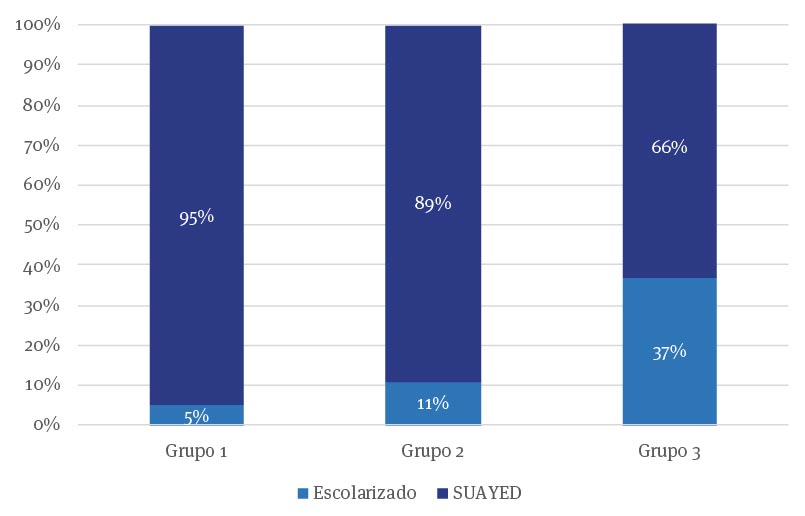 Acerca de cómo estos factores se comportaron respecto de las modalidades de Sistema Abierto y Educación a Distancia (suayed) y el sistema presencial escolarizado, en esta encuesta la mayoría corresponde a estos últimos (85%). Se destaca el grupo 3 con el porcentaje más alto de docentes en suayed con 37% y que corresponde a los que tienen mayor experiencia previa en educación en línea y a distancia (factor 4). Para el grupo 1, solo el 5% es docente en el sistema suayed, mientras que, en el grupo 2 este valor se duplica (figura 3).