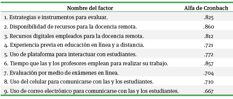 Dichos factores se nombraron a partir del tipo de variables que agruparon, destacándose aquellas que hacían referencia al tipo de estrategias de evaluación empleadas (factor 1), la disponibilidad de tiempo y acceso de recursos digitales utilizados para el trabajo docente (factor 2), el tipo de recursos digitales para la interacción (factor 3), así como la experiencia previa en la educación en línea y a distancia (factor 4), entre otros. El número de variables que agrupó cada factor se distribuyó en el rango de trece variables en el factor 1 “Estrategias e instrumentos para evaluar” a tres variables en el factor 9 “Uso de correo electrónico para comunicarse con los estudiantes”.