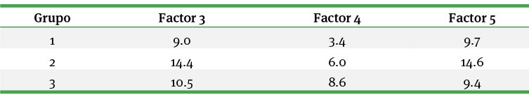 El grupo 2 presentó las medias más altas en el factor 3: recursos digitales empleados para la docencia remota (14.4) y el factor 5: uso de plataformas para interactuar con estudiantes (14.6), mientras que el grupo 3 la más alta en el factor 4: experiencia previa en educación en línea y a distancia (8.6). El grupo 1 por el contrario, presentó la media más baja principalmente en el factor 4 (3.4), seguido de la media del factor 3 (9.0) (tabla 2).