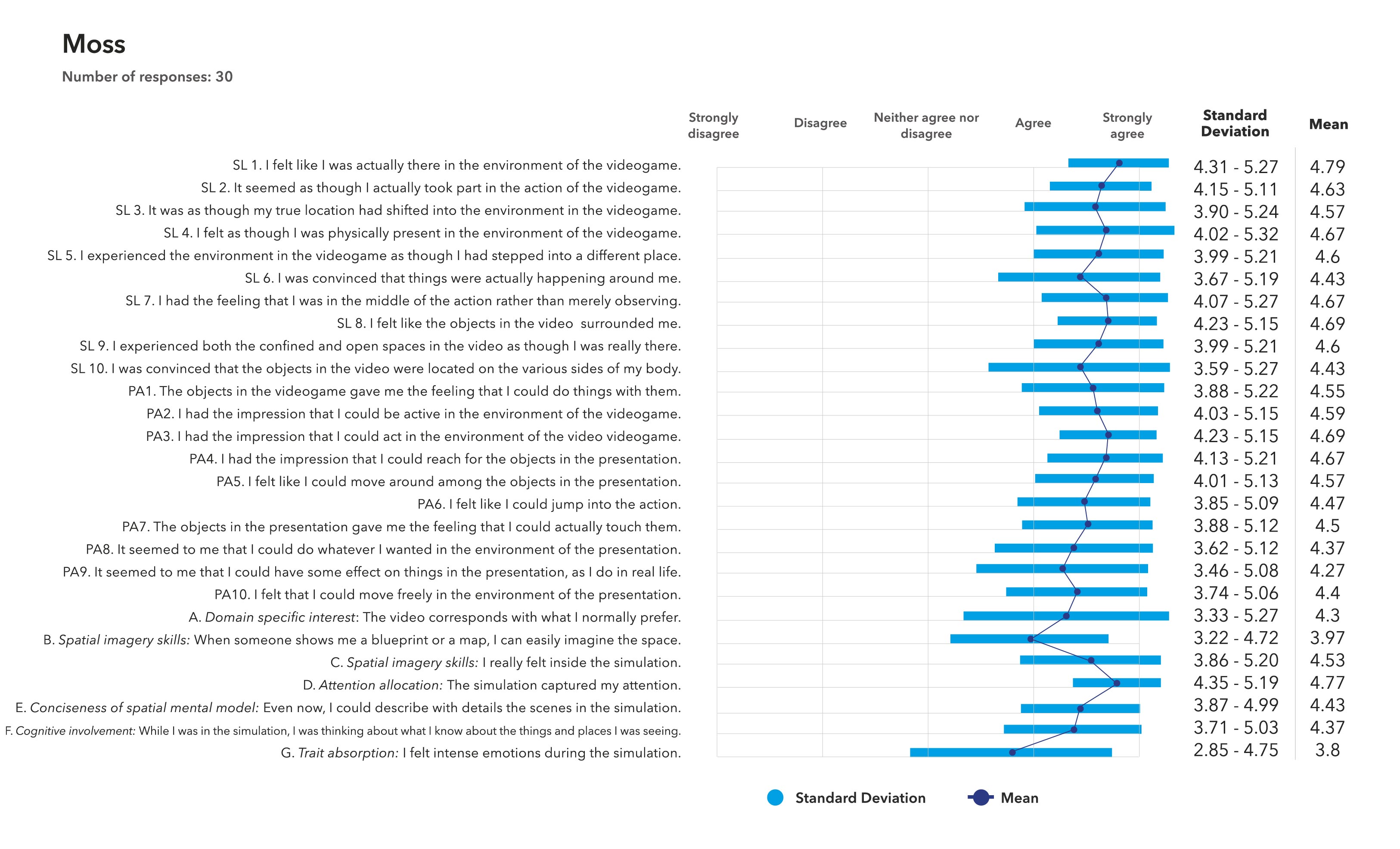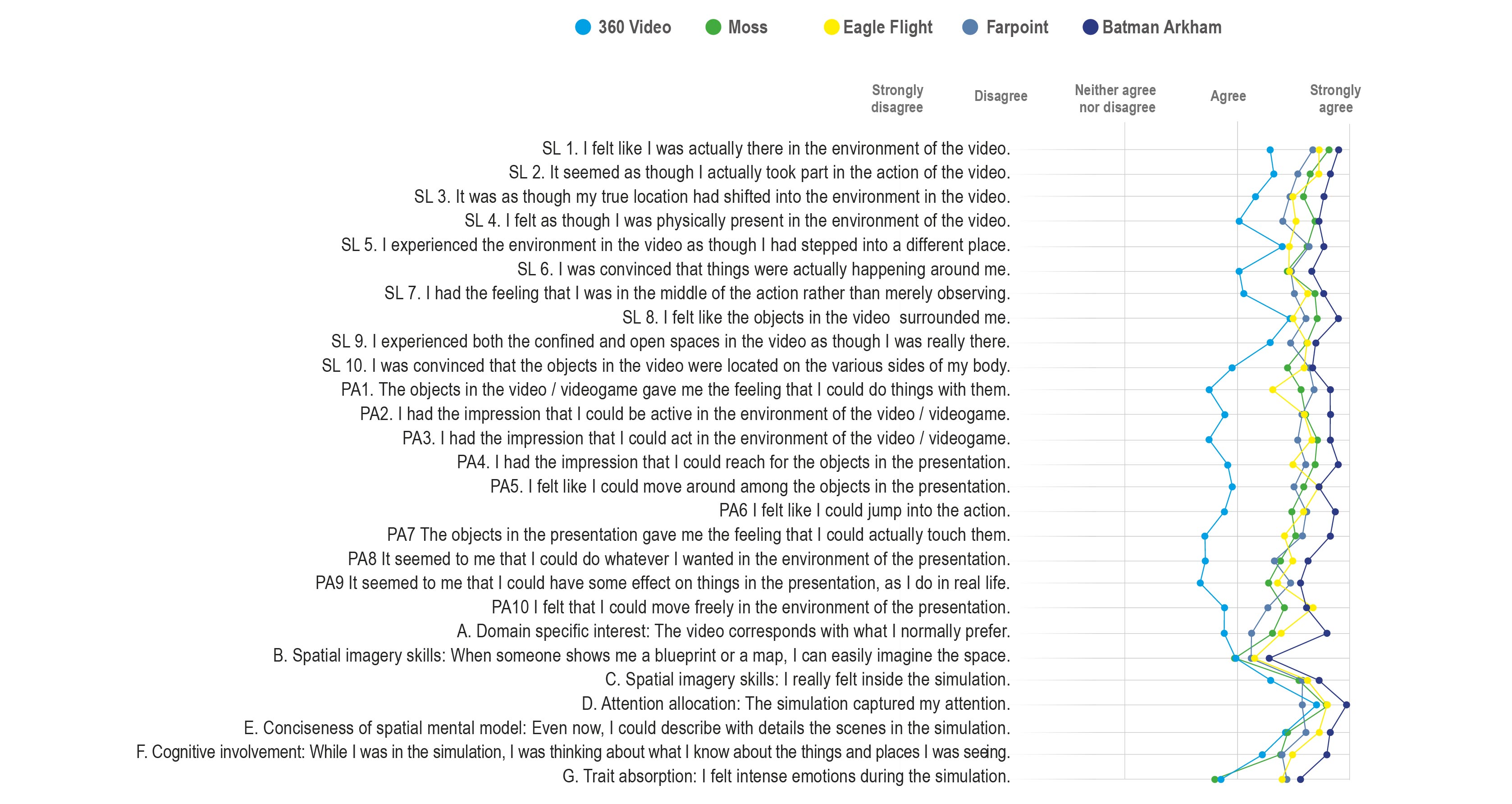 The 360˚ Video ranked considerably lower than videogames in most questions, except in question G. Trait absorption. When participants were asked if they felt intense emotions during the simulation, the lowest rank was given to Moss, closely followed by the 360˚ Video. However, when participants were asked in question SL.1 I felt like I was actually there in the environment of the videogame, Moss ranked second highest to Batman. This suggests emotional involvement, or trait absorption didn’t affect the intensity of spatial presence.