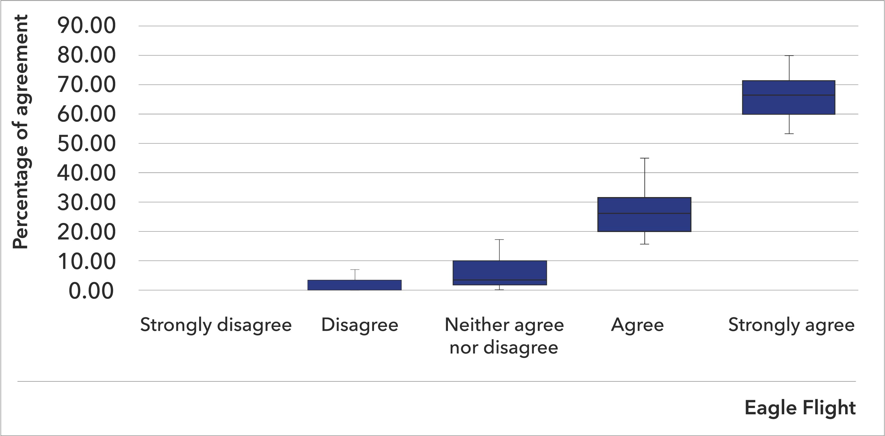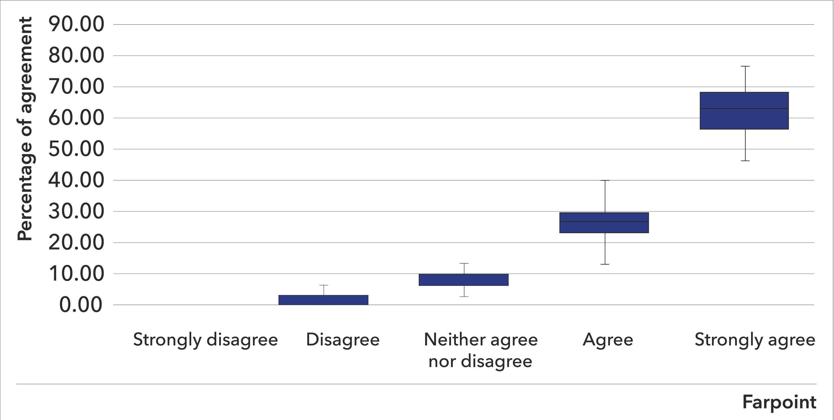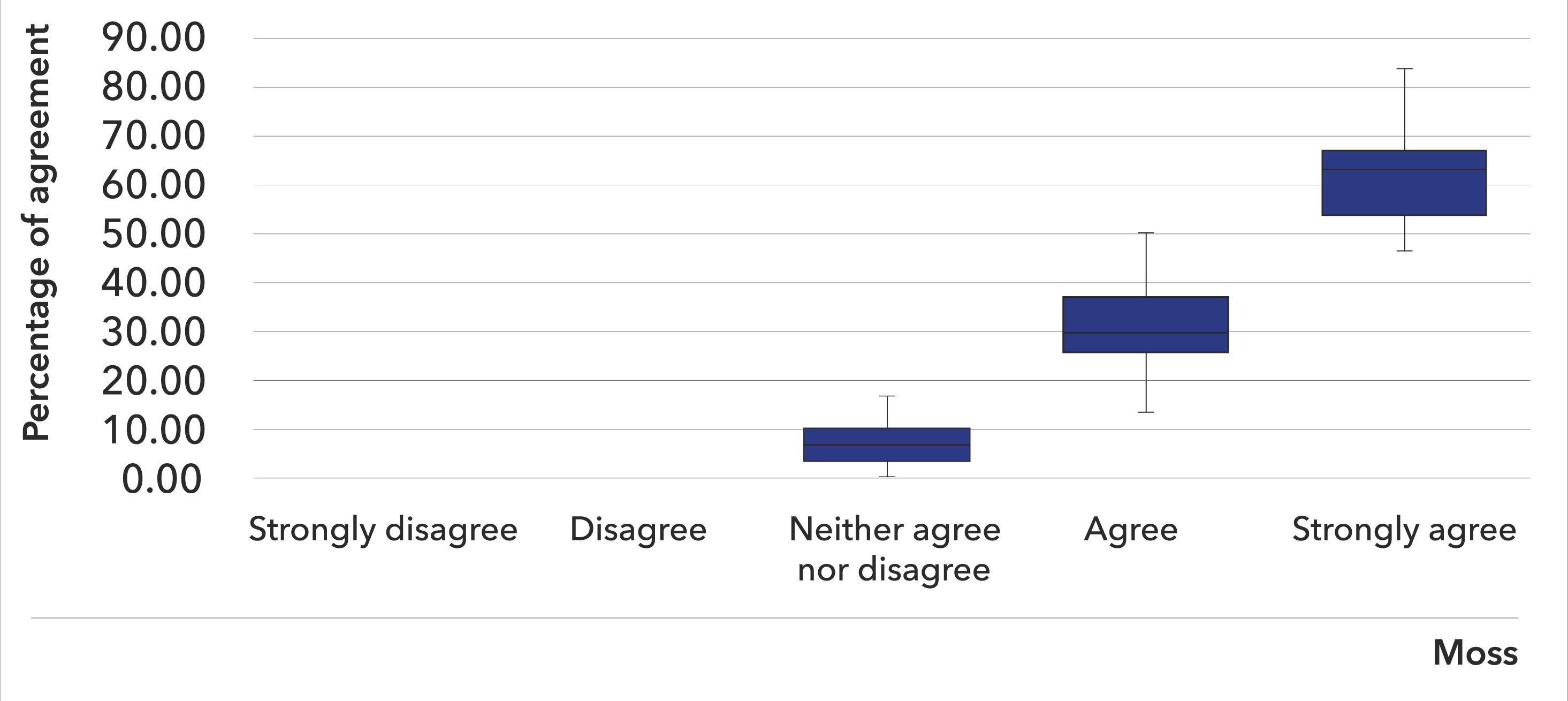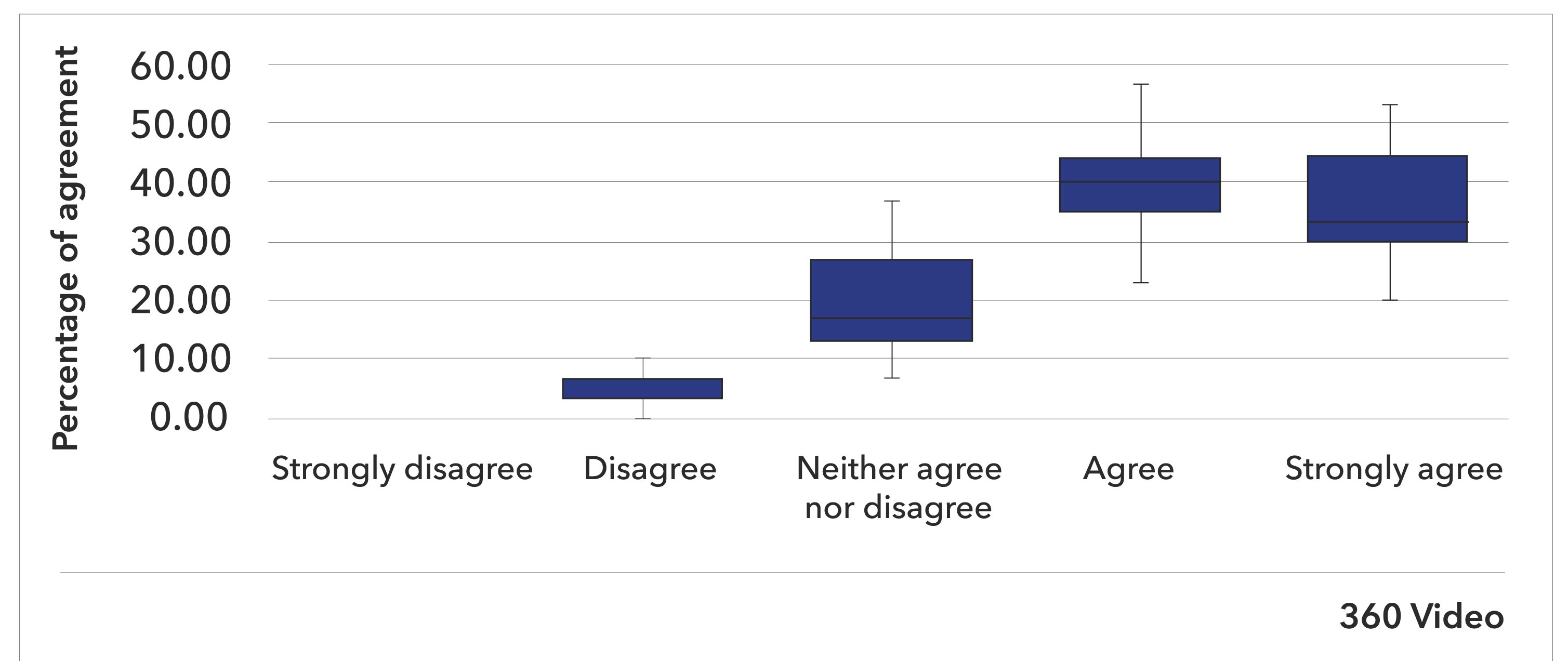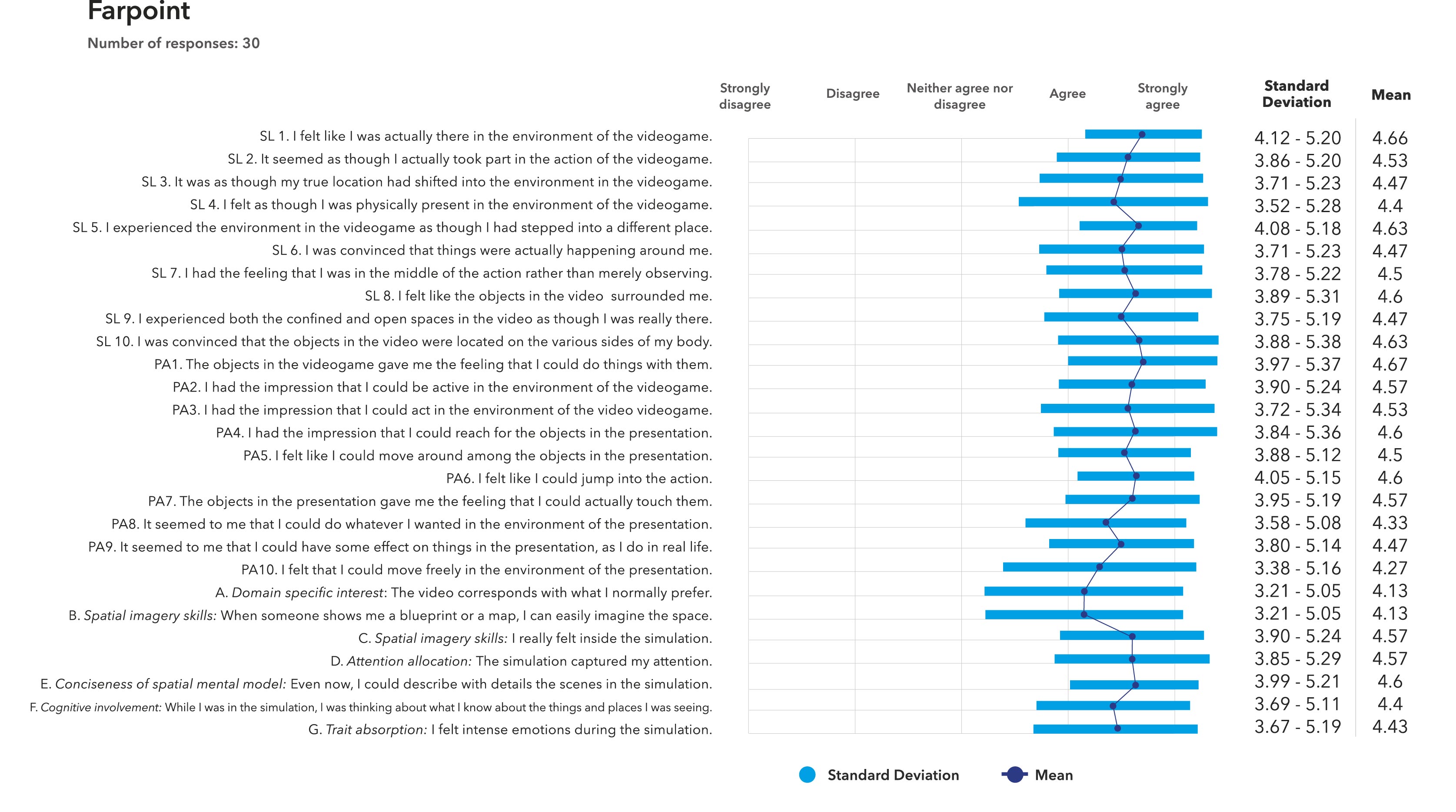 Participants ranked significantly different the perceived sense of spatial presence (χ2 = 287.34, df = 78, P < 2.2e-16). 80.25% of participants strongly agreed to the statements in the questionnaire, 16.05% agreed, 2.58% neither agreed nor disagreed, 1.11% disagreed and 0% strongly disagreed.