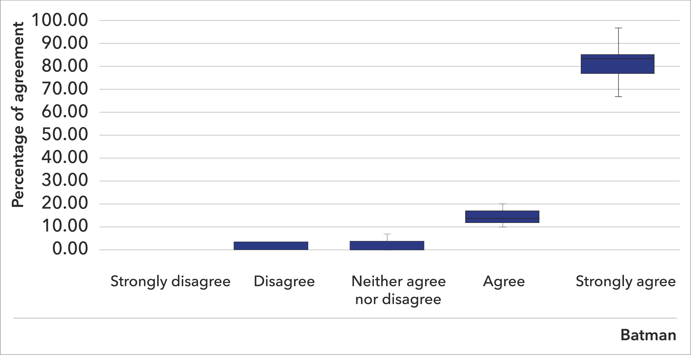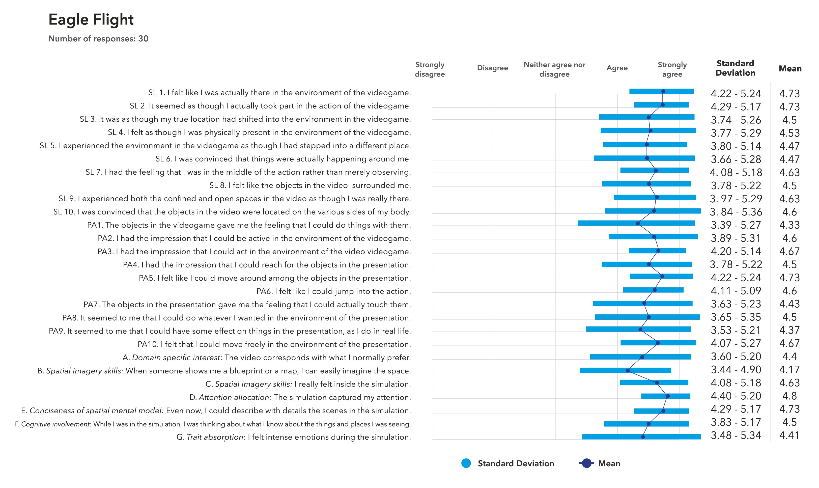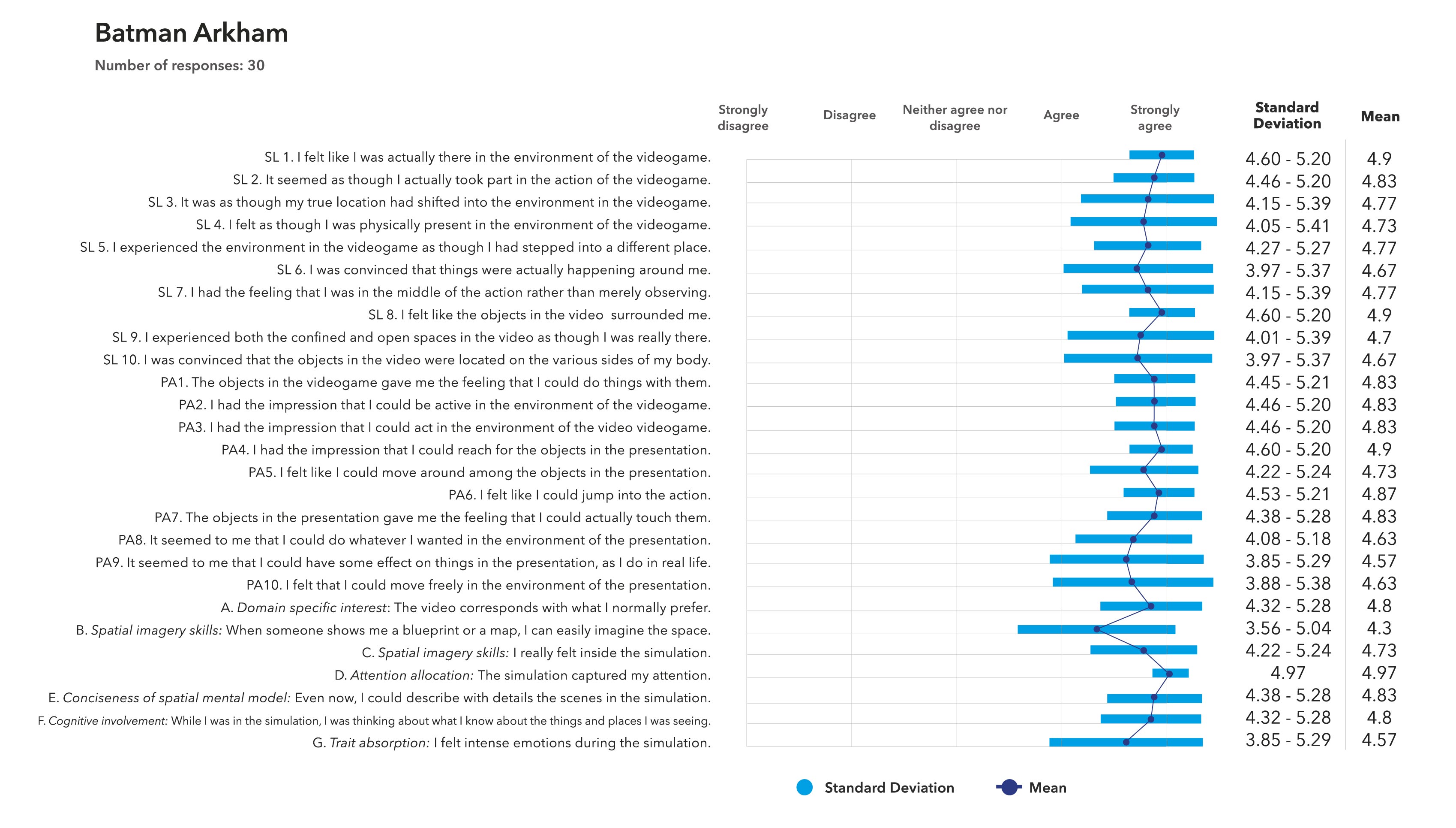As it can be seen in Figure 3, participants tended to agree more strongly with questions referring to Batman Arkham, showing a generally shorter standard deviation and a higher rank in the spes. The five-point Likert scale is expressed as follows: strongly disagree (1), disagree (2), neither agree nor disagree (3), agree (4) and strongly agree (5). The mean values for each question in each simulation can be seen in Figures 6, 8, 10 , 12 and 14.Figure 3 shows that the mean of answers that correspond to the simulation with most affordances (Batman Arkham) is closer to the parameter “Strongly Agree”, which represents a more intense experience of spatial presence. The lines represent the mean of answers of each simulation and show that intensity of spatial presence increases with variety of affordances.