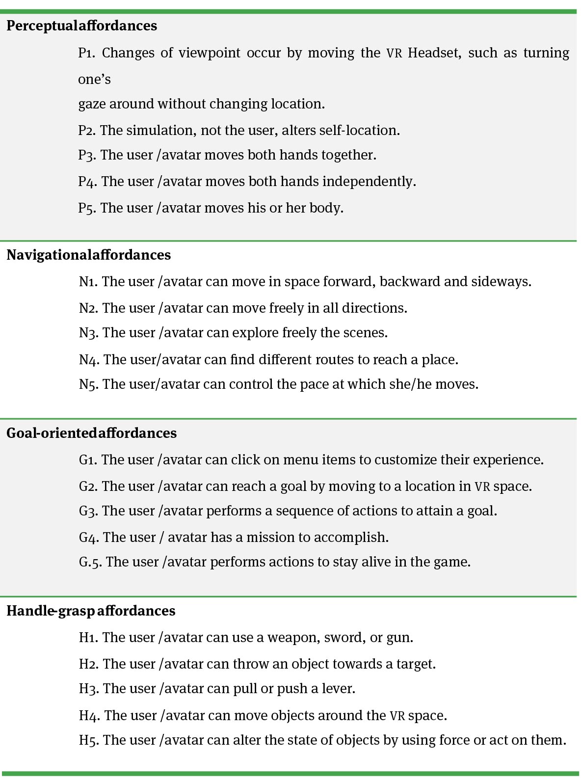 As Figure 1 shows, this research proposes a classification and ranking system of vr affordances, based on four types: perceptual, navigational, goal-oriented and handle-grasp affordances. This model was informed by previous typologies used for the categorisation of affordances in videogames (van Osch and Mendelson, 2011; Bentley and Osborn, 2019; Steffen et al., 2019; Cardona-Rivera and Young, 2013). The categories for vr affordances can also be related to Tversky three categories of spaces in spatial cognition: “the space of the body, the space around the body and the space of navigation” (2009, p. 208). The space of the body is embodied space, experienced from the inside of the body (Tversky, 2009, p. 203). Perception is anchored in the space of the body; it is the space in which visual, auditory, kinaesthetic and tactile representations are produced while engaging with vr environments. The second type of space mentioned by Tversky is the space around the body, also called peripersonal space (2009). It is the space close to our limbs, or the virtual representation of them. In peripersonal space we can grasp objects and interact with them. It is a lived space, measured in relation to our body’s movement and dimensions. The third space is navigational, one that is too large to be perceived all at one, so it must be constructed through pieces, experiences, memories, maps or information we know (Tversky, 2009, p. 205). Perceptual affordances are perceived from primordial embodied space. Navigational affordances appear in the space of navigation and refer to the possibility of voluntary spatial movement, such as walking along a path, moving sideways, exploring a scene, moving between locations, finding routes, flying, jumping or climbing and controlling the pace or speed of movement. Handle-grasp affordances appear in peripersonal space or the space around the body and refer to hand and arm movements performed with the controller to grasp and manipulate objects in the simulation, such as holding and firing a weapon; throwing an object towards a target, pulling or pushing a lever, picking up objects and moving them around or altering the state of objects by acting upon them, such as opening a door, putting together a puzzle, playing a piano or using a key. Goal-oriented affordances involve all spaces and appear as a sequence of events to reach a goal. They refer to actions needed to reach a goal in the simulation, such as clicking on menu items, having a mission during the game, and performing and avoiding actions to remain alive.