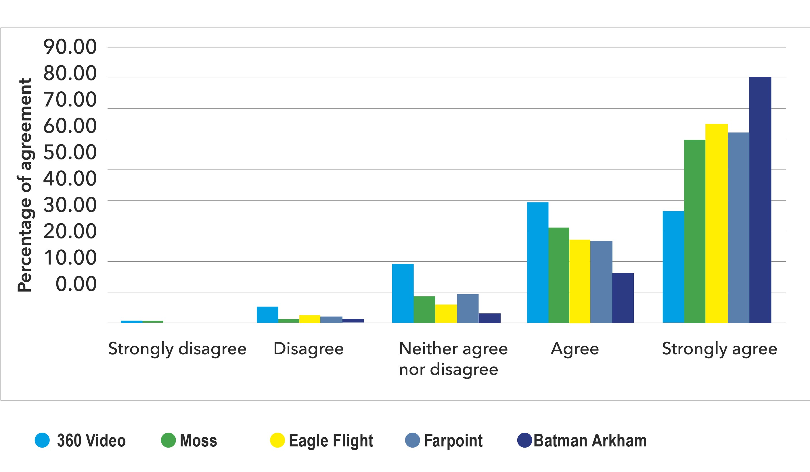 Overall, the 5 simulations presented significant differences in the ranking of spatial presence (χ2 = 49.159, df = 16, P = 3.118e-05). According to the Likert scale questionnaire, participants felt the most presence with Batman Arkham, followed by Eagle Flight, Farpoint, Moss and the 360º Video. These results closely align with the intensity of spatial presence reported by participants at the end of the questionnaire, they were asked to choose the game that gave them the most intense spatial presence, 50% felt spatial presence more intensely with Batman, followed by 26.67% choosing Eagle Flight, 16.67% chose Farpoint, 3.33% chose Moss and 3.33% chose the 360º Video. However, when participants were asked to choose the game they felt allowed them to perform actions more easily, 50% answered Eagle Flight, followed by Batman chosen by 36.6% of participants, Moss by 10% and Farpoint by 3.33%; 0% chose the 360º Video, this is obvious as the simulation doesn’t allow any interactive actions apart from head motion.