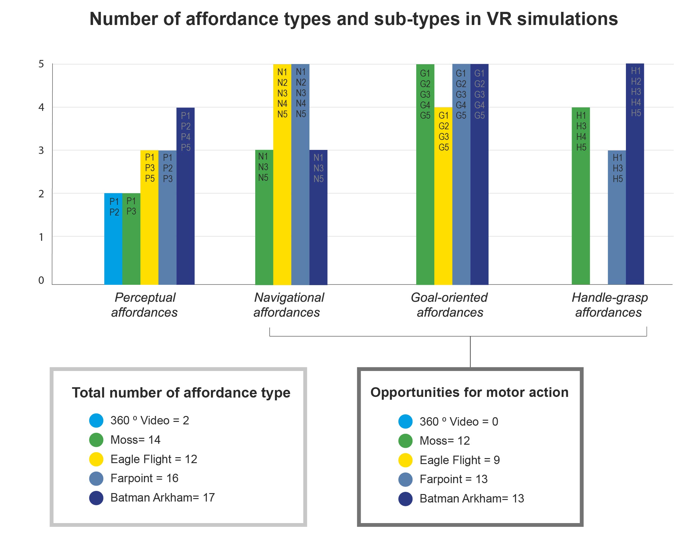 Figure 2 shows the number of affordance types and sub-types in each vr simulation. The 360˚ Video presented only two perceptual affordances but not the other types. Eagle Flight ranked higher on navigational affordances than on other types, because it is a flight simulator in which the navigation is the main activity for the user. Moss ranked higher in goal-oriented affordances than in handle-grasp because the game is played in third person, through a mouse avatar. Therefore, the user’s perception of movement is non-embodied. In other words, most of the grasping action is perceived from afar, not in first person. The opposite occurs in Batman, Far point and Eagle Flight, where actions are perceived in first person perspective.