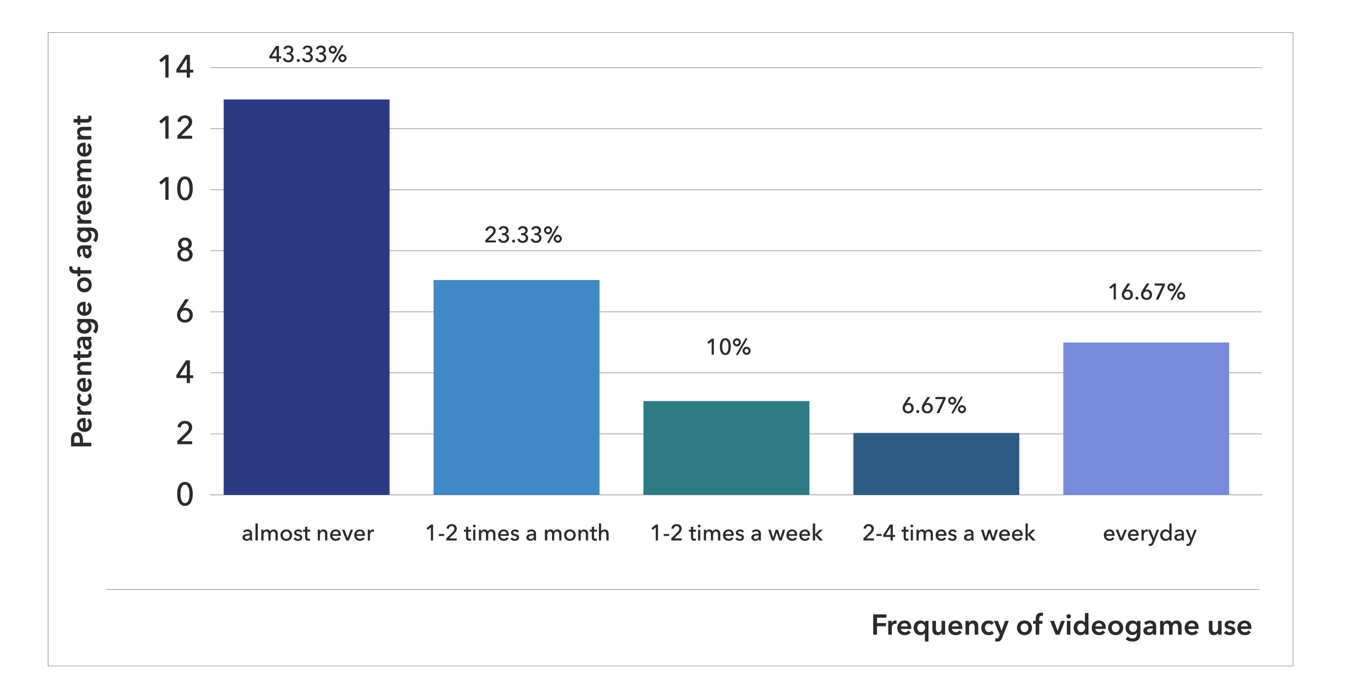 Figure 4 shows frequency of videogame use, 43% of participants answered they almost never played with videogames and 23% played less than once or twice a month. 80% had never experienced virtual reality before the experiment. Through direct observation, it was evident that users who almost never played with videogames showed lower dexterity with virtual tools. Only 5 participants stated that they play videogames almost every day, these same participants showed a superior level of dexterity with the hand controllers and with virtual tools inside the simulations.