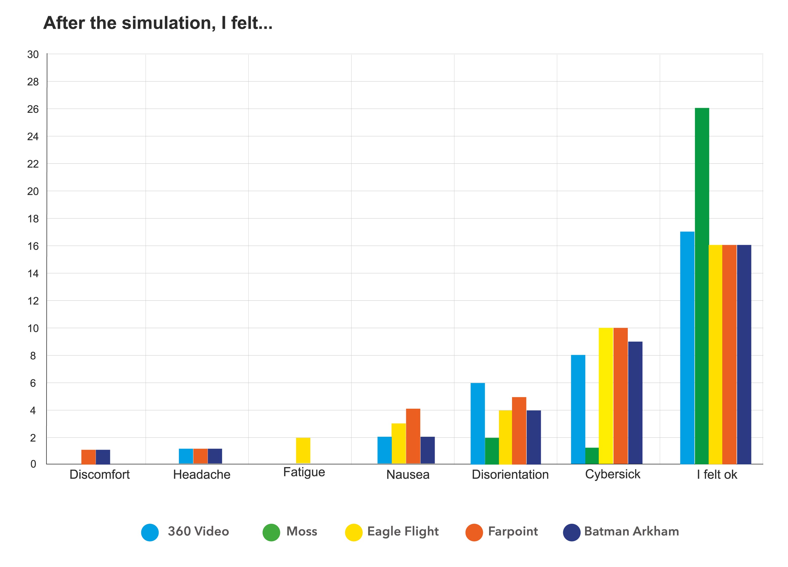 Although all participants were initially asked to verbally express if they felt any discomfort or if they wanted to have a break or stop altogether, none of them required stopping the experiment. This contrasts with their answers in the questionnaire, which asked them after each simulation, to indicate if they felt any of the physical sensations shown in Figure 5. As shown, most participants felt ok during the experiment. However, approximately one third of participants felt cybersick during the 360˚ Video (26.6%), Batman Arkham (30%), Eagle Flight (33.3%) and Farpoint (33.3%).