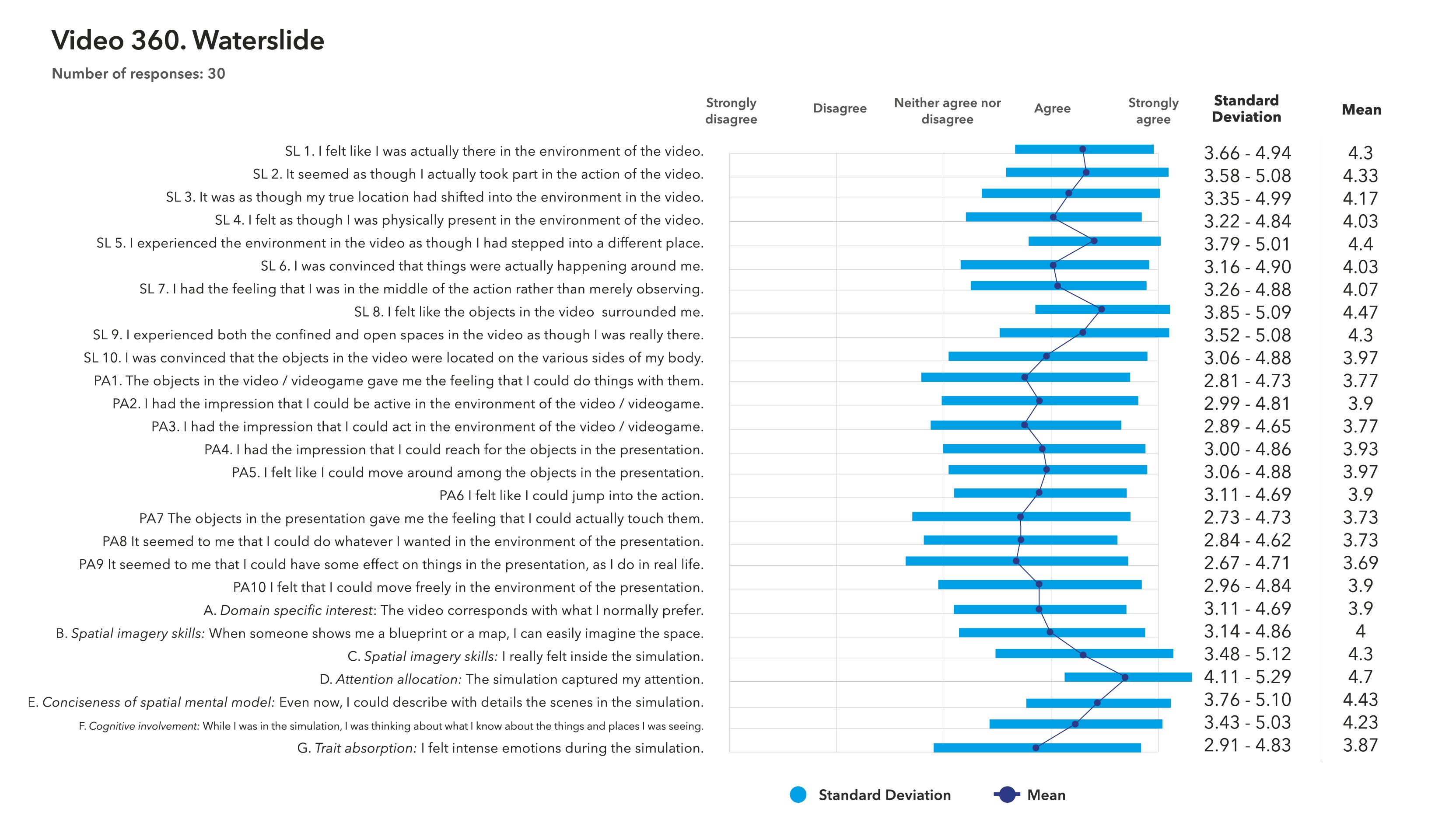 The 360˚ Video of a waterslide (Glass Canvas UK, 2016), involves a travelling camera moving though different computer-generated scenarios such as Las Vegas, Dubai, a mountain, the inside of a house and a lake. There is no interactivity; 360˚ videos allow an immersive view without giving the user the option of using tools inside the simulation or moving the position of the camera. The user can only look around in 360˚. Affordances are limited to the movement of the user’s head, which determines the viewpoint from which the simulation is perceived. No other opportunity for action is involved, there are no tasks, no interactivity and the user does not use the controller. As the camera moves through the waterslide, the user can see different objects and landscapes; some objects are near the user’s perceptual body. The experience of spatial presence was ranked differently between participants (χ2 = 444.84, df = 104, P < 2.2e-16). 39.20% of participants agreed with the statements describing the experience of spatial presence, 36.37 % strongly agreed, 19.12 % neither agreed nor disagreed, 5.06% disagreed and 0.24% strongly disagreed. The simulation ranked high in question D, which measured the level of attention in the user. Interestingly, even though there was no interactivity involved, participants had the sensation that performing actions was possible.