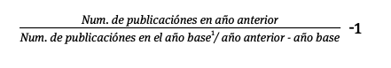Por último, se determina el indicador razón de crecimiento de la publicación, el cual considera las variaciones de publicaciones efectuadas en intervalos de tiempo determinados (Guo et al., 2020; Tenopir y King, 2014). Para este caso, se calculan las ratios correspondientes a cada año (2015, 2016, 2017, 2018, 2019 y 2020, respecto a su año inmediato anterior), además de la ratio global (considerando el cambio en 2020, respecto al 2015). Para ello se emplea la siguiente fórmula: