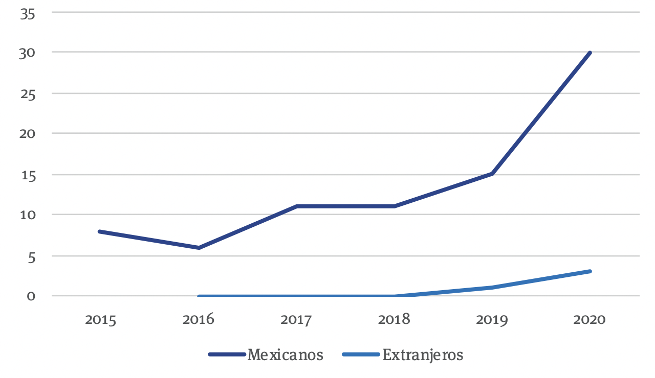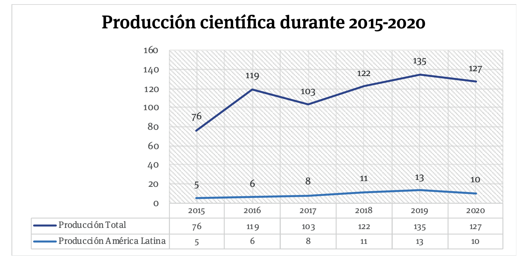 En la revisión documental realizada en el crmcyt (Conacyt, 2016) se detecta un crecimiento, año con año, de la cantidad de artículos disponibles sobre es; de tal manera que en la figura 4 se muestra la cantidad de trabajos realizados por investigadores mexicanos, así como aquellas publicaciones de investigadores extranjeros o afiliados a instituciones extranjeras, en los últimos 5 años, destacándose un notorio crecimiento del tema en el año 2020.