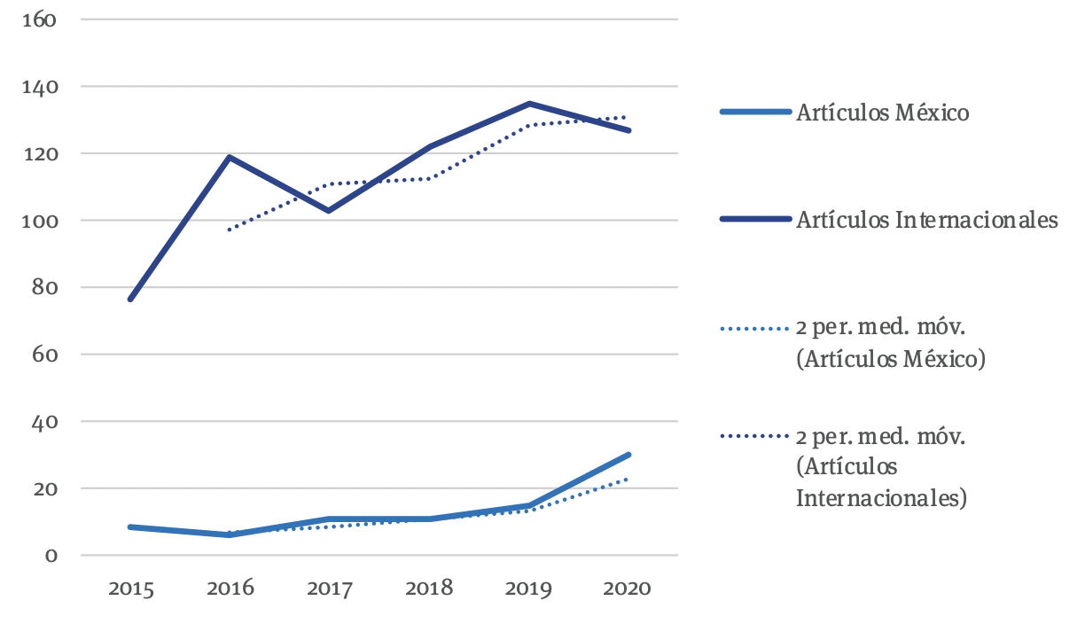 Nota: las líneas sólidas representan los valores absolutos de las publicaciones anuales; en líneas punteadas se encuentran el promedio de medias móviles para las publicaciones en México y las publicaciones internacionales.