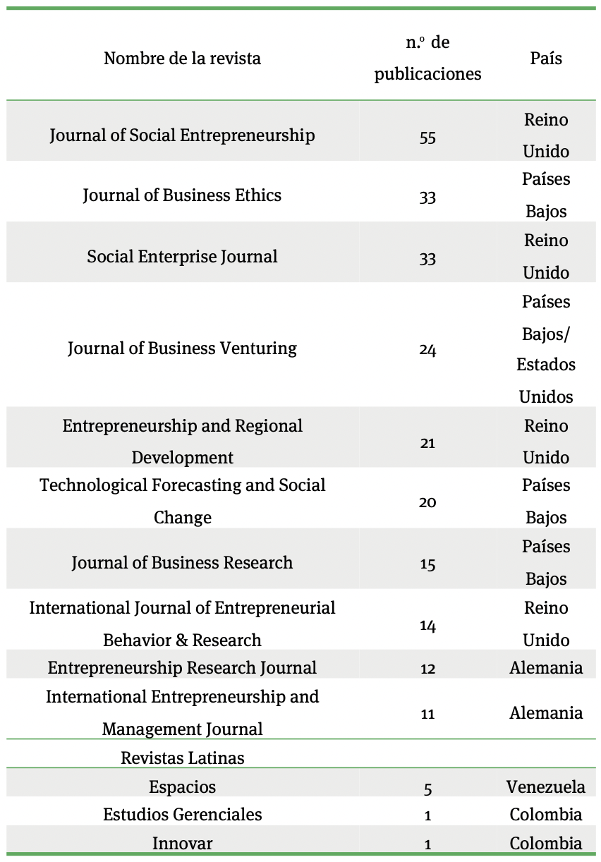 De este modo, la cienciometría permitió identificar la evolución en el tiempo, la productividad de los autores, colaboración, impacto y visibilidad de las publicaciones tanto a nivel internacional como en México. El análisis muestra una presencia a nivel internacional consistente sobre el es, destacando revistas especializadas en el tema y en donde la mayoría corresponde a publicaciones europeas como Journal of Social Entrepreneurship (Reino Unido, 55 publicaciones), Journal of Business Ethics (Paises Bajos, 33 publicaciones) y Social Enterprise Journal (Reino Unido, 33 publicaciones); respecto a las editoriales Latinoamericanas que se encuentran en Web of Science, son las revistas Espacios (Venezuela, 5 publicaciones), Estudios Gerenciales (Colombia, 1 publicación) e Innovar (Colombia, 1 publicación) las que cuentan con presencia de publicaciones con temática sobre es.
