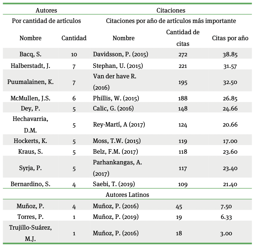 Se destaca como el autor con mayor número de publicaciones Bacq, S., con 10 artículos publicados; en segundo lugar se encuentra Halberstadt, J., con 7 registros. Sin embargo, el autor con el mayor número de citaciones resulta ser Davidsson, P., con una cifra de 272 citas y un promedio de 38.85 por año. Sobresale el caso de Saebi, T. (2019), siendo el artículo más reciente que posee un alto número de citas por año, evidenciando la pertinencia que tiene su publicación.